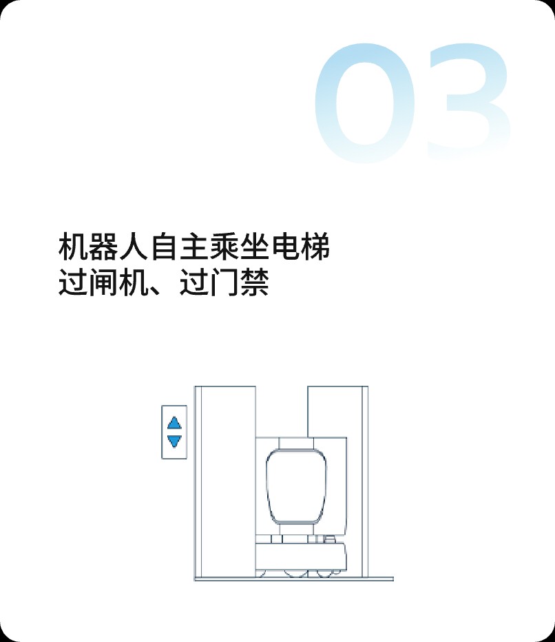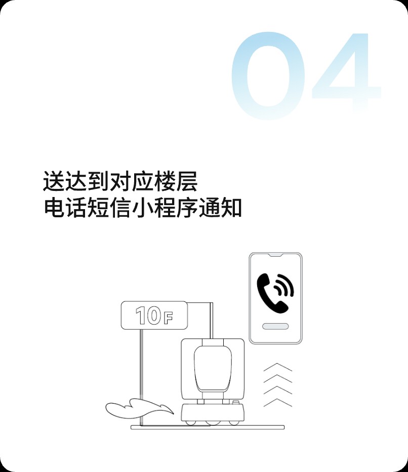 專為超高動態,超復雜場景,人流密集的寫字樓、公寓、醫院等場景的無人遞送而研發的一款全自主配送機器人; 打通閘機、電梯、門禁等物聯設備,用戶手機下單,機器人暢通運行,提供商業樓宇垂直100米到手配送服務。 一刻送達,極簡操作,讓用戶再也無需下樓,即可享受物品到手服務。
